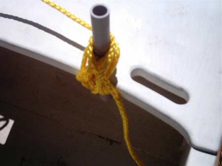 PVC is not as strong as oak, so use good judgment as to the strain put on these. I don't think anything larger than 3/8 inch line (as shown) should be used. Impact loads for sheets of large sail areas would probably break these.