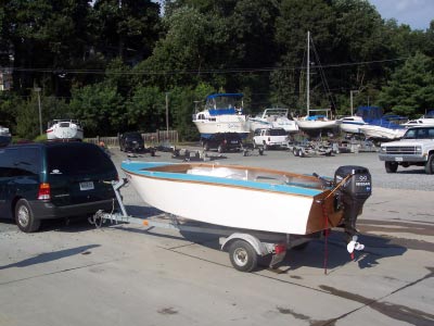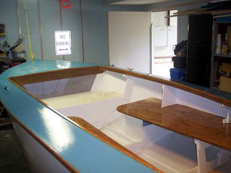The boat hull design was taken from the 1955 'Boat Builders Handbook'. The plans are from a boat named Playboy. Its about 14 feet with a 68 inch beam. After I built the hull I modified the interier to be more open with a bench seat up front so the kids and I have more room. The boat took about a year to build, very much part time. Then it sat in the garage for a year until I had the trailer and motor. It was built on a stongback with frames and was originally meant to be hard chine. Again I customized by cutting a half moon out of the frames at each chine and instead of putting in the hard chines I used stitch and glue for the bottom and sides. I used MAS epoxy.
