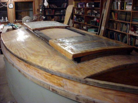 I completed my hatches for Picara. Made a light wooden frame with one inch ribs spaced about every 6 inches. Cut regular 1 inch bead board foam about 1/8 inch over sized and glued it inside the ribs with epoxy as a force fit, glassed both sides to complete a rain tight hatch. Seems plenty strong for it's purpose. Will also insulate from the hot sun as needed. About 7 pounds for the 32 X 38 inch aft hatch.