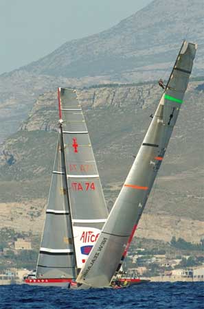 Two boats from the America's Cup, New Zealand/Arab Emirates and Italy's Prada. Each with crew aloft in the mast rigging. Oh Boy!