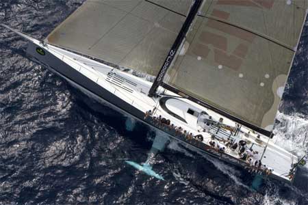 The SuperMaxi, Maximus, flying upwind with her keel canted and extended as well as both daggerboards all the way down for headway
