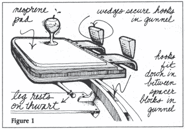 We built a small removable table (Fig. 1) for an 8-foot Norwegian pram, stowed it under the thwart, and used it for years. It worked great for picnics afloat. It had a couple of bent brass hooks on one side that fitted into the gunwale spaces, and we used two pine wedges to lock it in place. An adjustable leg on a hinge provided support regardless of the table's location.