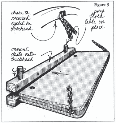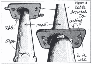 If appropriately located, a keel-stepped mast offers another spot to attach a table (Fig. 2). The table can be designed to slide up and down the mast and may be stored by attaching it to the overhead. Make stops on the mast for supporting the table, and if the table is large, also add overhead support chains.