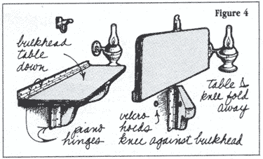 Another bulkhead-mounted type uses a hinge and folds flush, up or down, when not in use (Fig. 4). For support, a hinged knee also folds flat against the bulkhead, held in place by a spot of Velcro. Piano hinges give support and are an ideal hinge for the wide span of a table leaf. They also provide alignment and strength for accordian-leaf tables.