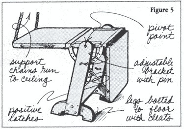 For those long runs in the trades, when the boat is on the same tack for days and nights on end, an adJustable table may be a big help in coping with an inclined world below decks (Fig. 5). By providing some type of locking mechanism — a thumbscrew or adjustable bracket — the table may be permanently held in one position a little closer to horizontal. Also remember that the folded leaf of a table must be held tightly in place or will bang constantly, even at anchor. Shock cord works well.