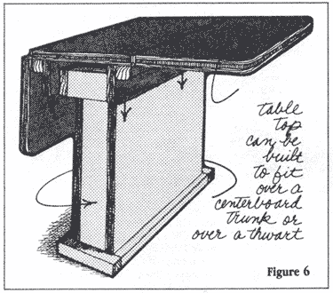 Centerboard trunks, situated as they usually are on the centerline of the boat, also provide a good support fora drop-leaf table (Fig. 6). The table can be built so it's removable. Tables traditionally run fore and aft, but in small boats they may be mounted athwartships. Use whatever works best.