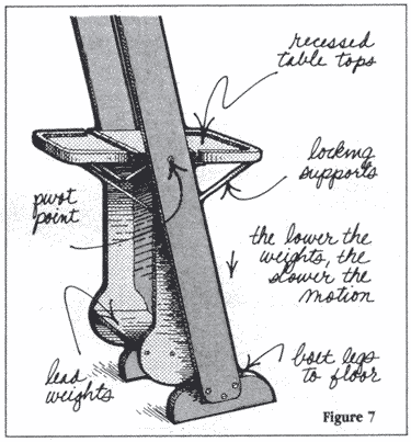 lf you have the space for it, a counterweighted drop leaf that maintains a semblance of levelness athwartships may be the ultimate in seagoing tables (Fig. 7). As with all large tables, the legs must be securely bolted to some point of attachment, whether sole, bulkhead, or overhead. Experiment to get the weight and arm length just right. Too much weight below the pivot point will make the table too sluggish; too little weight and the table's motion will be too snappy. Length of the arm from pivot to weight is also critical. What's right for one boat may not work for another. You should provide a positive stop to quiet a counterweighted table when not in use and attach the table securely lest it comes adrift and walks all around the cabin in rough weather.