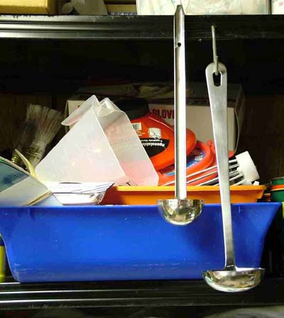 What really started this train of thought was ‘dipping out’ the ‘sealer’ for Joanne’s shelf unit. I was going to finish the office shelf unit with Clear Acrylic Poly - for a good, hard, surface. I wanted too put down the first coat as a ‘sealer’ before I cut the plank to size and did the routing. This way I would get a cleaner edge to the cuts. Normally I’m a little lax with the application on these sort of projects, and apply right out of the can. In this case, because I had already applied a Red Mahogany aniline dye wash coat, I didn’t want to contaminate the full quart. Therefore I dipped out 2 ounces. “Dipped Out” ?? ‘How did he know it was 2 Ounces ?? EASY - the stainless steel ladle said so! ‘Stainless Steel? - ‘Mr. Cheap’? I actually have two -one is small & deep and the other is wide & shallow - thanks to Harbor Freight and the local ‘Dollar Store’. They allow me to ‘dip’ measured quantities from gallon cans down to 1/4 pint ones. If I can get solid Stainless for about the same price as ‘plated’ steel - so much the better. If soapy water or paint thinner won’t clean them - a blow torch will . . . and NO RUST.. If their not marked? Compare one to the other or pour a dipper of water into a small measuring container. The ‘dosage cups’ that come with liquid cough medicine are about one ounce - with measurements in cc’s embossed. {they also measure a nice shot of Rum - for ‘medicinal reasons, of course.}
