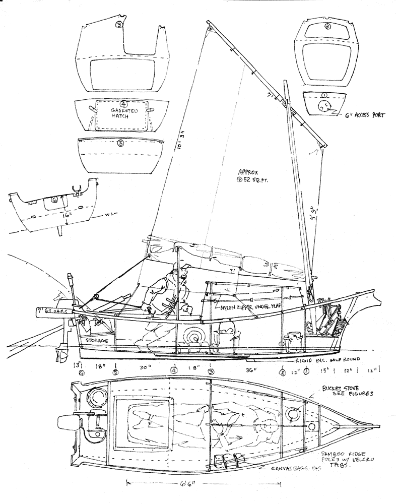Next we have a small self-draining wet gear storage area in the bow for anchor, rode and a couple of fenders. The rig is a simple standing lug of approx. 52 sq. ft. with an 11-foot mast and a 7 1/2 foot spar. The mast can be a young spruce cut out of the woods in late fall, skinned, tapered and oiled a few times. Bamboo will make a nice lightweight spar. The sail to be used is loose-footed, though a spare oar or second bamboo stick might be a useful “boom” when running. Keep in mind that this is a “motorsailor,” so the sail area has been kept modest, and no provision has been made for upwind sailing, though I suspect that a few degrees could be made to windward as even a keel as long and shallow as pictured adds up to a couple of square feet.