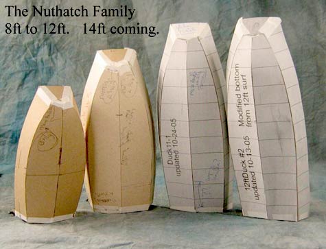 The design has been scaled up for works in progress, with lengths of 10, 12, and 14 feet. The 14 foot version has a deep, surf bashing/cutting bow and vee bottom.