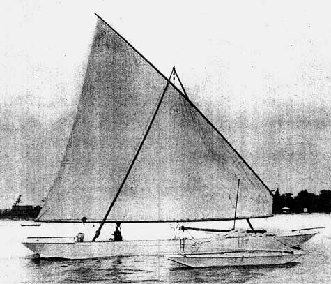 Being something of a genius, Commodore Munroe took that sail shape with the stuck-in-the-middle mast and went ahead and made a proa or three that functioned, and from his description in The Rudder, planed too. All this from a 30-foot hull made from two side planks “instant boat” style and some crossplanking on the bottom. We know it sailed, because we have pictures.