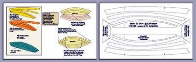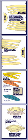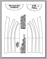 I took parts of the various Laura designs and copied them onto a new drawing, and stretched and tweaked them around to get closer to a final concept of what I wanted. That took about eight models to get to a workable (looked like one anyway) double ended hull shape. Then I worked on it only in my spare moments while building the Laura Bay. With building the Laura Bay out of the way I had more time and a large supply of "Red Baron" pizza boxes to make the models from. Finding cardboard long enough can be a challenge when I'm doing a lot of model making. The 15.5ft Wendy Bay and 14ft Plyzar (both require matching up printout pages) were even more of dilemma until I found some 6ply poster board at a local office supply store. The O&P Pod took twenty one more printouts and models after the first eight attempts, to arrive at a final design that I'm happy with. But the model I'm happy with now may have slight differences later when the prototype hull is build, and again when the plans go on sale.