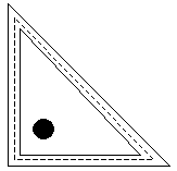 To make the triangular patches, take two squares of the sail material, one six inches square and the other five inches square. Fold both in half along the diagonal, insert the smaller into the envelope formed by the larger, and place at the corner of the sail. To attach to the sail, sew round the larger triangle close to its edge (dotted line). This will keep the smaller triangle in place and provide sufficient thickness for the eyelet to grip but not be too thick for your sewing machine. The eyelet (shown as black circle) should be positioned at equal distance from each edge of the sail, but not so far in as to cause the sail to fold when a line or shackle is attached.
