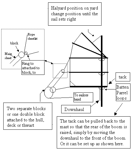 The main sheets consist of a rope which runs from the sailor's hand through one block, which is fixed to the boat, up to a block attached to a loop of rope (sheetlet) connecting the top two battens. Then down through another block fixed to the rear of the boat and up to the boom (see fig 6). This exerts a diagonal pull at all points of attachment and keep the leech taut.