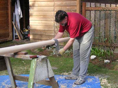In this picture, I’m sanding a mast, not an oar, but it shows how I do it. It’s a good workout too, although the camera doesn’t capture that.