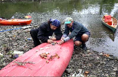 In the meantime, Rodman had another idea. He gathered up a couple of plastic bags and some styrofoam Chinese takeout boxes. With a leatherman that Pete found in his kit, Rodman pried the edges of plastic more or less back into place, and then started a fire with the foam on the bottom of his boat. This was too much for Axel, who was sure that you should hold the burning plastic in your hand and drip it onto the crack. He jumped up and down, and put his hands to his head when he saw what was happening. But Rodman had a plan and pretty soon he had a nice little fire going and was sort of spooning the gooey plastic around over the cracks. It was touch and go there for a minute, because the plastic hull kept a lot of heat and was softening and threatening to collapse into a really big hole until we doused it in water to cool it off and let it harden. In the end it worked just fine though. Not a leak for the rest of the trip.
