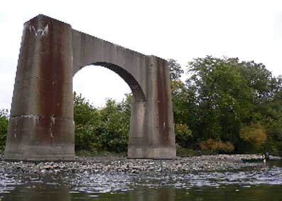 So anyway we were enjoying the day. It had started to clear up a bit, I had cracked a beer, and sipped it as we passed through a long slow part of the river. Next up was a riffle formed by a long-ruined dam that had been put in something like 200 years ago to provide power for a flour mill. Peter and I surfed the eddies below and Rodman took some photos and heckled us, especially Peter when he dipped a gunnel under the current flowing over the old dam. The old, abandoned Water Street bridge spans the river just over the old dam, and I remembered another evening on the Mahoning.