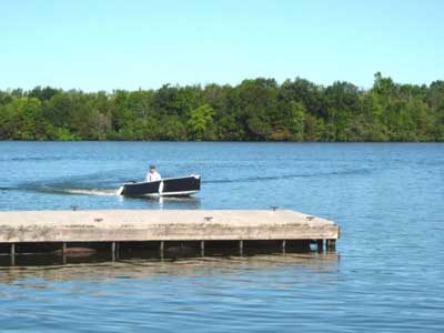 WHILE I WAS AT THE MESSABOUT T3 HIT THE WATER FOR THE FIRST TIME. SHE FLOATED HIGH ON HER MARKS AND HANDLED MY WEIGHT SURPRISINGLY WELL. I HAD BORROWED A FRIEND’S NEW MERCURY 3.3 AND HEADED OUT. I HAD INSTALLED A REAR SEAT WHICH WAS IN THE WRONG POSITION. IT NEEDS TO BE FORWARD ABOUT MIDSHIPS. PAUL MCLELLAN OF BOLGER HOUSEBOAT FAME GAVE ME A MILK CRATE TO USE AND THE BOAT WAS PROPERLY BALANCED. I TOOK OF WITH A NEAT WAKE CAUSED BY THE DRAKE TAILS. SHE SKIMMED ACROSS THE LAKE AND I WAS PLEASED WITH HER SPEED AND LOAD CARRYING ABILITY.
