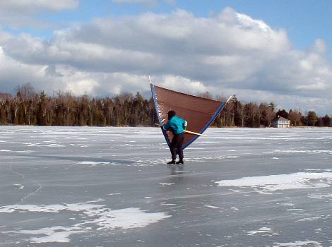 Call me a fool or call this fun, but with a ten by ten foot, 4 mil polytarp, two 10-foot sticks, three bolts, and a couple of nuts and fender washers, you too can accelerate to 12 knots on figure skates if you have a bit of smooth and hard water. Knee pads, elbow pads, and helmet are advised. There's nothing dull around here in winter. Next time you see an old guy, intent, grinning and a moving on down the lake, please excuse him if he doesn't wave back.