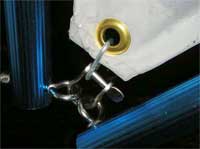 Throughout this picture/story you will see that I have used 1/8” “Quicklinks.” Especially through the grommet at the Tack, Clew and Head of my sail Its elongated shape allows the sail’s grommet to be attached to the pole end eyebolts, and may easily be removed. The size of the Quicklink used is determined by the maximum opening between ends. In a couple of cases I found that I had to grind a few threads off the bare end in order to allow a slightly thicker object