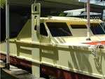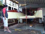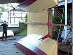 The boat was built in my carport (which has a flat roof) when it came to turn it over I simply unbolted the carport from the posts on one side and raised the roof on that side with wooden posts clamped to the carport posts, an old wooden mast was then secured down the underside on the bridgedeck, the boat was then lifted high enough with a small electric chain hoist at one end of the secured mast and a wire come-along at the other end when the boat was high enough it was simply spun and lowered. My son and I did this quite easily and was considerably easier than trying to take it out the carport and needing a few bods turn it.
