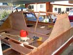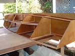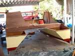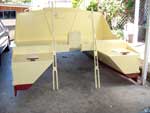 The sides were built from 6mm (1/4 inch) ply instead of 9mm(3/8 inch). I managed to get 4 sheets of marine ply on a special for $NZ2O per sheet - I could not resist it. I had intended to put bunks in the hull and I ran the the centreplate stingers the full length of the sides to stiffen them.