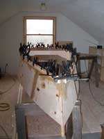 Meanwhile,upstairs, the bigger bits were going together. The room, slated to be the library, opens to a balcony over the living room and, thereby, leaves access to the front door for a large object. I might have got away with a 16 footer! Time, though, was critical and why the Teal was chosen in the first place. I had set a deadline to make the Lake Pepin Messabout by sail. With parts all over the house and working every spare minute I stood a chance.