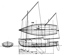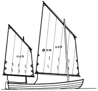 As Mike gazed up at the sky, he had an excellent view of the two sails, which stretched taut between their booms and their yards. The boat carried a Cat-Ketch rig (otherwise known as a Periauger rig) on two masts, both of which were completely free-standing and unencumbered by stays and shrouds. In fact, the only rigging required was a simple halyard and down-haul on each mast, and one sheet for each sail – you can’t get much simpler than that! Nothing on the rig required fittings bought from a chandlery – just bits of wood, rope, and cloth. The boat raced down the quartering waves in a thoroughbred fashion, and Mike was able to correlate the motion of the boat, the movements of the helmsman’s hands on the tiller, and the set of the sails. He tended to critisise his friend for lack of concentration while sailing (Mike being somewhat obsessive), but today he could relax and enjoy the ride, considering the favourable wind direction.