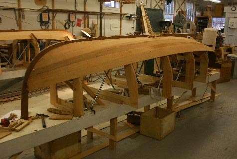 The 12-foot Grandy dinghy (foreground) and the 9-foot Grandy dinghy are being planked with western red cedar.