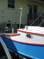 It is held on with the cleated line so it can be removed from inside the cockpit when approaching piers and other unyielding objects. Those of you who are smarter than me won’t have to worry about this, because you will have sensible lug rigs devoid of nonsense like jibs and bowsprits.