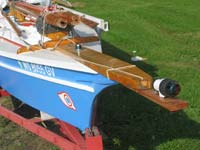 After fussing with that bowsprit mess, this mounting is quite easy. It is a piece of stair railing with a plywood baffle mounted on L brackets. The lamp screws to both plywood and railing, and the railing steps into a pair of U-bolts on the inside of the transom. I thought about using pole clips, but this member needed to be solid, as it also sometimes serves as a handhold when climbing aboard. Just don’t forget about it when going under a low bridge!