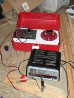Now our current draw at 12 volts is 3.6 amps total. Looking at the battery capacities above, a couple NiCd tool batteries could do the job for a short outing, but we really ought to have 10 SLA batteries for long battery life. Unless of course you’ve gotten smart by now and gotten self-contained portable lights. It’s easy to recharge eight (or 16) NIMH AA batteries.