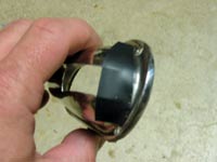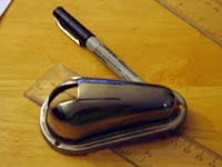 I thought I was going to make this permanent by gluing in a piece of stainless steel shim stock. But it is extremely difficult to bend any sheet metal to smoothly match the compound curve of these shells. Instead I painted the mask directly on the lens. Be sure to rough up the plastic a little so the paint will stick. I used gloss black acrylic model paint. Make sure your paint is water-based, since some solvents dissolve acrylic.