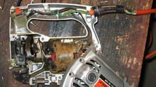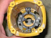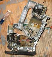 The DeWalt angle grinder was an interesting case. Greg had a jug of glue tip over on a high shelf. The angle grinder got glue through the vents and the motor was immobilized. I didn’t take “before” pictures because I hadn’t yet realized this topic would be an article. Suffice it to say that getting it all out required a complete disassembly and several hours of very careful work with a chisel and chip carving knife. Good thing it wasn’t epoxy! Here’s a photo of the brush assembly where you can see a little of the remaining glue inside the case.