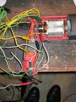 Here you see the hammer drill with the switch bypassed. (Note that you see one of my feet on a piece of scrap wood and leather shoes. I was home for lunch when I took the photo, but when applying power I would have on dry sneakers and be standing on both scraps of dry wood.) At the bottom of the photo you see a brown lamp cord connected to the black and red clips (clip color, not wire color). You can see the red connect to the lower end of the top field coil. I couldn’t reach the terminal on the bottom field coil, so the black connects to it by clipping onto its wire at the switch. The green connects the other end of the top field coil to the upper brush, and the yellow connects the other end of the lower field coil to the lower brush.