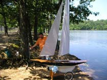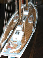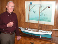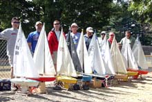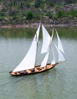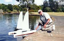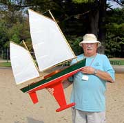 Steve Levesque, now First Officer of the Marine Modellers Club of New England and until the end of the last year, Commodore, is not only an excellent craftsman, but a most energetic and enthusiastic and prolific model builder. He is seen here with his ketch Jammon which is a John Storrow design, the boat also shown photographed under sail by Bill Richards in the second photograph. The club has no official home base or clubhouse and sails at a pond in Medway, Massachusetts about 25 miles west of Boston. Bill tells me that the club is about fifteen years old and was originally focused on member-built scale model RC boats, but the range of interests covered has now broadened to help compensate for declining membership.