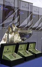 Two tremendous photos of this boat taken at the Porto Cervo gathering are by Rolex appointed photographers, Kurt Arrigo (left, top photo), and Carlo Borlenghi (left, bottom photo). Just as Hans Staal of the Netherlands is to model sailboats such a brilliant shutterbug, Borlenghi and Arrigo are to the big boats, reason that they and Daniel Foster are contracted to capture high quality Rolex watch company photographs for editorial use at Rolex sponsored events. Overall Series winners were Mariette in the gaff-rigged vintage division, Marjatta in the vintage Bermudian division and Emeraude (Classic yachts built between 1950 and 1975). Some trophy table (right photo above) isn’t it! Go on now, let those photos inspire you classic lover modellers to build a model or two of Shenandoah.