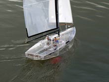 Always prepared to`push the barriers’ is New Zealand’s Ron Rule, one of Auckland’s Ancient Mariners. Ever eager to experiment, his latest model was a Starlet in style totally `see through’ yacht with frames of 5mm Perspex, sides, bottom and deck of 2mm Perspex. Now I have to tell you that the boat though heavier than the average Starlets sailed in the Auckland fleet sailed unbelievably well, looked exciting and drew huge attention at the Onepoto pond just over the Auckland harbour bridge on the north shore side. It was only a matter of time (days in fact !) before the appropriately named Sea Thru which I photographed (above) when launched)was hit broadside by another Starlet, resulting in a cracked hull. Not that it sank but it somewhat spoiled its appearance if looked at from the starboard side. Built by the unflappable Ron, it has long been fixed.