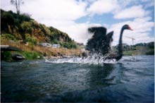 One day there was all this flappin’ and ploppin’, and lots of splashin’ and the odd feather flyin’ (see first pic above) as the huge black swan that thought it was a Grumman Goose seaplane, frumped around the waters near the launch ramp at Quarry lake on Auckland’s north shore as Alan Hayes steered clear, still managing to capture the ensuing commotion. With his `boat cam’ camera (with a one click and then reload system) mounted on his One Metre he has taken some great photos. That’s one story the more believable of the two, the other being…that the swan was actually a 4 channel RC operated model used by the club to frighten and shoosh away all the real swans that were there that day, so that the North Shore Radio Yacht Squadron fleet had some sailing space on the water!