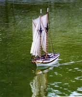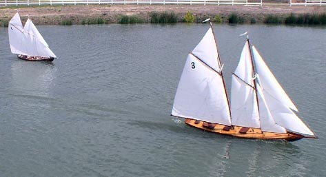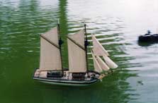 Two of Andrew Charters stunning schooner models stretch their sea legs on the waters of a South Carolina pond, Puritan in front, Bluenose behind.