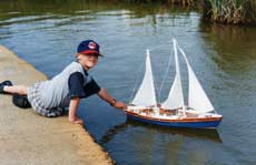 Rex has built the model plank on frame, timbers used being Kauri and Ash ply, the main sails controlled by winch arms, the fore sails static set. Being quite bluff in the bow the Belle Orlean seen in the first two photos above is not a fast boat but looks good on the water, particularly in a good breeze. He is seen with another of his boats in the third photograph, that one a ketch 850mm or 30” in length called Marlene built on a fiberglass hull to which the deck was replaced with a wood planked one, and kauri and mahogany cabins. A good little boat for windling that!