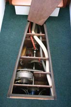 The main hull remained the same shape, but gained a raised foredeck for much more volume in the forward cabin, a nacelle beneath the main hull was added to carry the batteries, motor and prop shaft (other major changes were - a bow thruster was fitted, the cabin extended aft, the galley enlarged and much shifting of interior spaces - not one bulkhead from the original design remains in the same position).