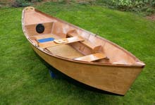 The gunwale is a traditional ladder type with spacer blocks separating the inwale and outwale, which provides stiffness to the sheerline of the boat to handle the stress of hard rowing and rough water. The gunwale also provides necessary support when rolling the boat over for storage. The inwale and outwale are mahogany to match the plywood face veneer and for lightweight versions spruce or fir can be used to save weight. Light weight allows a larger payload, but the real advantage comes in getting the boat on and off the water. To make launch and retrieval even easier, with the slick graphite bottom the boat can be dragged over parking lots, launch ramps and gravel beaches preventing having to be lifted or trailered into the water.