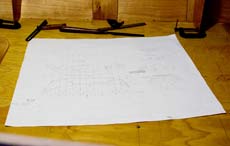 Patterning is somewhat time-consuming but there is no complex “lofting” required. A plywood panel is marked off in one foot increments and measurements are all made from the plywood factory edge. To further simplify, the topside panels have straight line edges and panels are joined with epoxy glued doubler pads which reinforce the hull and provide a simple and efficient method to join the factory edges.