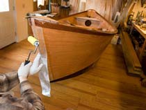 Hull components are sealed with an epoxy coating that prevents watersoak, increases abrasion resistance and simplifies long term maintenance. The plywood hull is held together with concave shaped beads of thickened epoxy and strips of fiberglass tape applied to the exterior seams. The hull is constructed by lacing together thin plywood panels with plastic ties. The ties are gradually tightened to hold components in position while a concave shaped bead of thickened epoxy is applied to hull seams, often called “stitch & glue” or “tack & tape”. Vertical compartment bulkheads are installed at the same time to secure hull panels at the correct angle. All exterior seams are rounded and fiberglass tape seals and reinforces the exterior chine seam and the bow and transom. Graphite is combined with epoxy to cover the bottom with a tough, very slick and abrasion resistant coating, which allows the boat to be dragged over launch ramps, parking lots and gravel beaches. The epoxy/graphite mixture is applied around and above the chine seam to form a waterline.