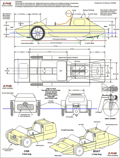 At this writing this is more than a design exercise, as I intend to build E-PHIB over the winter months. I have selected the power plants, batteries, controllers, guages, and body/hull materials. Only the wheels and tires remain to be reasearched.