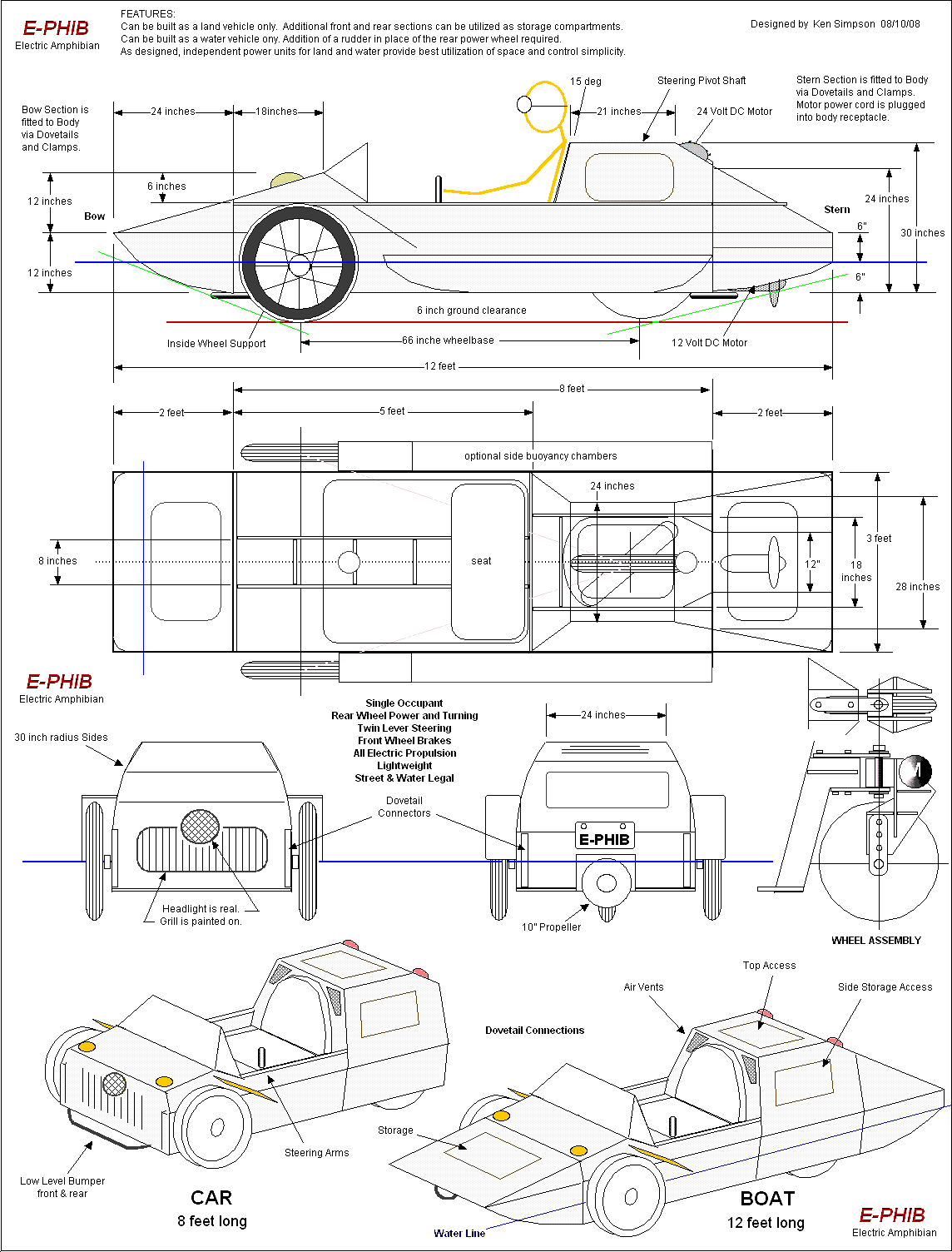 The vehicle is tentatively named E-PHIB, short for Electric Amphibian. Its intended use is for fun around a pond or small lake, or just a spin around town. It will travel on land, sans the water appendages, at about 15 MPH, for a distance of 15 miles, when fully charged. It will be powered by a 600 watt 24 volt scooter motor. Later, larger motors can be retrofitted, if desired. On water it will go at hull speed, which is about 5 MPH, powered by a 12 volt trolling motor head. Water distance should be about 8 to10 miles, round trip.