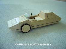 Building the E-PHIB in 3 sections allows for easier storage (the body can stand on end when batteries are removed) easy transport and possible future options. There will be a time when it's use will be primarily around town, not on the water, so why carry the extra bulk. Although the 'looks' of the land vehicle could use some improvement, it does take on a 'Jeep' utility appearance, and works well within the confines of the design. Once fully assembled, the boat version has a cutting-edge look, and should perform well in the water, given it's low center of gravity and centrally mounted heavy batteries. There will also be an optional flip-top that will act a a sun shade or rain protector.