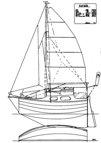 Fafnir is descended from Gimli, a study drawing intended to give an idea what would be required for a race around the world in boats only 10ft (3.048m) long. That race was to be held on a course where the longest single leg was only about 1800 tradewinds miles, and where support would be available at every port. A race like that is a big deal for such a small craft, and Gimli had a canting keel, daggerboards for lateral plane and balance, a fully battened carbon fibre rig and every trick I could think of to make her competitive as well as seaworthy.