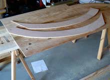 After some comical battles with my memory of high-school geometry, I was able to trace curved shapes that made full use of the 4-foot width of the half-inch plywood with flat “feet” for attachment to the keelson. |